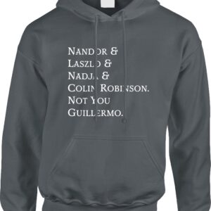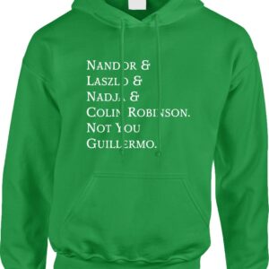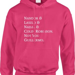 This shirt, it is very majestic. It lists all of your favorite powerful and eternal vampires—Nandor, Laszlo, Nadja, and Colin Robinson—but not Guillermo. Because Guillermo is a familiar, not a vampire (yet… or maybe never). Wear it to strike fear, respect, and maybe slight confusion in mortals. 100% cotton, zero percent sunlight resistance. Do not wear to a garlic festival.