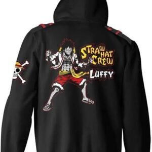 Start your pirate adventure on the Grand Line with our One Piece Luffy Full Zip Hooded Sweatshirt! Designed for treasure hunting on the high seas, this unique hoodie features dual sheathed button-down shoulder epaulettes, chest pockets, Luffy's jolly roger embroidered on the sleeve, and contrasting red drawstrings & inner hood lining. You’ll feel like a member of the Straw Hat Pirates aboard the Thousand Sunny when you wear this premium One Piece merch!